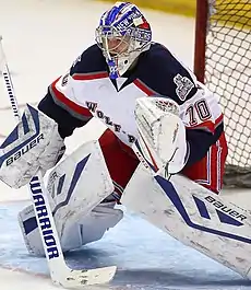 Skapski began the 2014-15 season with the Greenville Road Warriors of the ECHL but was called up to the Hartford Wolf Pack of the American Hockey League (AHL) after playing just one game to replace Jason Missiaen, who was demoted to Greenville.[3][7] He made his AHL debut on October 24 and recorded his first shutout on October 26.[6] He played well enough at Hartford to remain with the team until his promotion to the Rangers, with a 2.38 goals against average and a .914 save percentage in 24 games.[3][7] Ranger staff felt he was making "good progression" at Hartford prior to his promotion.[8] According to sportswriter Paul Doyle, Skapski's "even demeanor" was key to his successful transition to the AHL.[1]