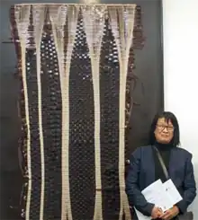 In 2000 and 2002, Razakatrimo was exhibited in the Fourth and Fifth editions of the Dak'Art Biennial. In 2002, her work was exhibited in Gifts and Blessings: The Textile Arts of Madagascar at the National Museum of African Art in Washington D.C, where she is represented in the permanent collection.[5] In 2007, she was included in the 12th International Triennial of Tapestry in Łódź, Poland[2] 2018 her work was included in Madagascar, arts de la Grande Île, an exhibition at the Musée Quai Branly.[2] She had solo exhibitions at Fondation H in Antananarivo in 2018 and 2023-4, respectively titled L’art au quotidien (Everyday Art) and Bientôt je vous tisse tous [Soon I will weave you all].[7][1] Her retrospective show at Fondation H presented over 90 pieces spanning 20 years of her career.[8][9]
