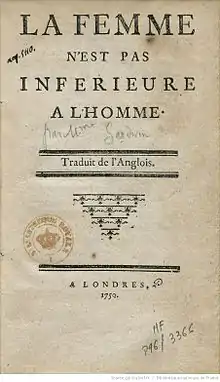 Puisieux published one of her most famous works in 1750 entitled, La Femme n'est pas inférieure à l'homme ("Woman is not inferior to man"). This was a publication of a previously anonymous piece where Puisieux translated and brought up topics in the book about the equality of sexes.[5] She based these questions found in the 1405 publication, La Cité des dames (The City of ladies) by Christine de Pisan. The following year, it was republished under the title Le Triomphe des dames (The Triumph of the ladies.) It is sometimes debated whether Puisieux's future husband Philippe-Florent de Puisieux (1713–1772) helped Puisieux with the translations used in the final publication.[6]