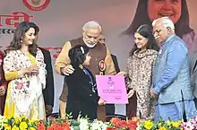 Since 2014, Dixit began working with UNICEF to advocate the rights of children and prevent child labour and child trafficking.[163] She participated in a fashion show organised by Lilavati hospital, to support the 'Save & Empower the Girl Child' initiative by the organisation.[164] The same year, the Government of Madhya Pradesh appointed her as the brand ambassador for its Mamta Abhiyaan (maternal and child health) campaign.[165] Dixit collaborated with Vogue for its Vogue Empower series on a short film on gender policing, 'Boys don't cry', directed by Vinil Mathew.[166] She was appointed as the brand ambassador for the Beti Bachao Beti Padhao campaign, by the Government of India in 2015, that aims to generate awareness and improve the efficiency of welfare services intended for girls.[167] She lent her voice for narrating the story of one of the eight girls who featured in Girl Rising: Woh Padhegi, Woh Udegi, a film on the education and empowerment of girls.[168] Dixit was appointed the brand ambassador and launched MAA (Mothers Absolute Affection), a flagship programme to ensure adequate awareness is generated on the benefits of breastfeeding.[169]