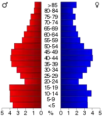 The age distribution was 27.10% under the age of 18, 6.90% from 18 to 24, 27.40% from 25 to 44, 23.40% from 45 to 64, and 15.20% 65 or older. The median age was 38 years. For every 100 females, there were 97.40 males. For every 100 females age 18 and over, there were 93.10 males.