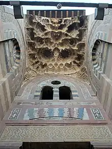 The qibla iwan is flanked on either side by the two mausoleum chambers, accessed from the sides of the courtyard. The smaller mausoleum, on the right (to the south) has no mihrab, while the larger mausoleum, on the left (to the north) has a mihrab flanked by two windows.[2] The larger mausoleum contains the tomb of Khawand Baraka (Umm al-Sultan Sha'ban) and a daughter of Sha'ban, while the smaller museum ended up being the tomb of Sultan Sha'ban himself (when his other mausoleum complex was unfinished upon his death) and one of his sons al-Mansur Hajji.[1][2] Both mausoleum domes have simple round squinches in the transition zone between the square chamber and the round base of the dome above rather than the more typical muqarnas-sculpted pendentives found in Mamluk architecture.[2] The squinches nonetheless have some decoration by using two-coloured masonry with a radiating motif.[2] Other than this, the mausoleums are unadorned.