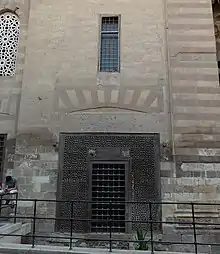 The entrance portal is one of the building's most remarkable features. Like many Mamluk buildings, the entrance is set in a recess within the exterior walls, the top of which is crowned with a muqarnas (stalactite or honeycomb-like carvings). The muqarnas canopy here is more or less pyramid-shaped like the entrance portal of Seljuk/Mongol buildings in Muslim Anatolia at the time, possibly of the same inspiration as the portal of Sultan Hassan's massive madrasa-mosque, built just over a decade earlier. Nonetheless, the overall decorative design is Mamluk and features heavy use of multi-colored stone and marble.[2] Right below the muqarnas hood is a triple window (smaller but of similar shape as the other triple windows on the building's exterior) flanked on either side by shallow decorative niches in the shape of pointed arches, all featuring multi-colored stone. There are also several inscriptions in Arabic, both carved and inlaid, of one word or of whole passages, around the portal. One inscription wraps around two arch-shaped decorative niches on the sides and around a triple window in the middle, winding its way up and down from one side of the portal to the other. Smaller one-word inscriptions include the word Allah inlaid around the triple window, and small black-and-white inscriptions at the center of the decorative niches on either side. The triangular muqarnas hood at the top of the portal is also framed by an outer rectangular frame filled with carved arabesques, albeit relatively faded.