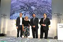 After Manuela Carmena had won the municipal election in 2015, the project was rethought.[9][10] Tensions arose between the new mayor and a number of commercial partners like the bank BBVA, as the former insisted on adding more residential apartments and green spaces to the plans and would have rather kept the involvement of private contributors to a minimum,[11][12] for a time promoting an alternative proposal which would have been significantly less ambitious, but also cheaper and faster to realize.[13] However, as this iteration of the plan was rejected by both participating enterprises and legislative bodies,[12] the involved parties ultimately came to a compromise that, while incorporating many of the proposed changes, remained largely faithful to the project's previously intended physical scope,[4] with its name being changed to Madrid Nuevo Norte.[1] A notable exception to this was the northward extension of the Paseo de la Castellana, which was scrapped from the plans.[14]