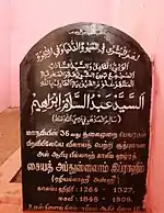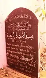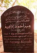 That night Periya Hazrat had a dream. A mass of people were running, and Periya Hazrat asked where they were going. People replied as they are going to see Allah's Tajalli. Periya Hazrat joined them. When they reached a place, at the top of a small hill, Allah's Tajalli was glittering very gloriously and everyone there enjoyed it. A voice came toward Moulana Meer Ahamed Ibrahim saying what you wished for is given. It was early morning and time for Fajr prayers when Hazrat woke up. Now Periya Hazrat’s teacher asked him again to leave the madharasa. He added, "Yesterday I told you to go, because you were unfit to learn, but today I need you to leave the madarasa as I am not qualified enough to teach you."[4] This is how Moulana Meer Ahamed Ibrahim became educated. Periya Hazrat then returned to His home town Madurai and started a madrassa to educate Muslims from all over Tamil Nadu. Many scholars of Islam in Tamil Nadu were Periya Hazrat’s students, and those scholars in turn started madrassas all over Tamil Nadu. For His outstanding wisdom and expertise in the Islamic Fiqh laws, Mir Ahamadh Ibrahim was appointed as the government chief Kazi of Madurai and Kaziul Kuzaat by the then Nawab of Carnatic in India. He served excellently with Khilafatship and Kaziship and added Glory to Islam in Madurai and other parts of Tamil Nadu.[5] Periya Hazrat died in 1872, at the age of 63, leaving four sons (Saajid Alaihir Rahma, Qadi Syed Abdul Qadir Ibrahim, Syed Mahmood Ahmad Ibrahim, Contractor Hazrat, constructor of Maqbara and Saqi Meer Niyamatullah Ibrahim) and a daughter, Saalima, wife Saalim Hazrat.