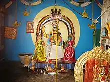 Other versions of the tale say that Veeran and Velaiyammal attempted to elope but were caught by the guards. Mistaken for a bandit, he faced the punishment of dismemberment. Both Bommi and Velaiyammal prayed to the goddess Meenakshi that he regain his limbs, which he did. But he believed he must die by the will of the goddess, and he cut his own head off with his sword, dying thereafter. Both Bommi and Vellaiyammal threw themselves into his funeral pyre, and the king was sorrowful once he learnt his true identity. Veeran then prayed to Goddess Meenakshi to ritualize his death properly. Veeran is then reborn as a member of the lower class, disrupting normal life in a dream of the king, and troubles ensue in real life. When the king asks Shiva and Meenakshi regarding this, they tell him it is because Madurai Veeran's death was not honoured correctly.[2]