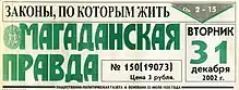 Magadanskaya Pravda (Russian: Магаданская правда) is a Russian regional socio-political twice-weekly newspaper, published in Magadan on Tuesday and Friday with a circulation of 10,000-20,000; it was established in 1932.[1][2]