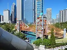 Maggie Daley Park is a 20-acre (81,000 m2) public park in the Loop community area of Chicago operated by the Chicago Park District. It is near the Lake Michigan shoreline in northeastern Grant Park where Daley Bicentennial Plaza previously stood.[1][2] Maggie Daley Park, like its predecessor, is connected to Millennium Park by the BP Pedestrian Bridge.[3] Designed by landscape architect Michael Van Valkenburgh, the park had its ceremonial ribbon cutting on December 13, 2014, and is named for Maggie Daley, the former first lady of the city who died of cancer in 2011.[4][5] The park was almost entirely remade with multiple new features including a new field house, an ice skating ribbon, climbing walls, landscaping and children's playground. An older section of the park maintains a garden dedicated earlier to honor cancer survivors. The park is bounded by Randolph Street, Monroe, Columbus and Lake Shore Drives.[6] Construction took 2 years and cost $60 million, including rebuilding an underground parking lot.[3]