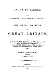 Magna Britannia, being a concise topographical account of the several counties of Great Britain was a topographical and historical survey published by the antiquarians Daniel Lysons and his brother Samuel Lysons in several volumes between 1806 and 1822. It covers the counties of Bedfordshire, Berkshire, Buckinghamshire, Cambridgeshire, Cheshire, Cornwall, Cumberland, Derbyshire, and Devon. The work was curtailed in 1819 on Samuel Lysons' death.