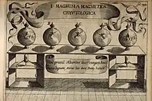 Magnes sive de Arte Magnetica ("The Lodestone, or the Magnetic Art") is a 1641 work by the Jesuit scholar Athanasius Kircher.[1]:192 It was dedicated to Emperor Ferdinand III and printed in Rome by Hermann Scheuss.[2] It developed the ideas set out in his earlier Ars Magnesia and argued that the universe is governed by universal physical forces of attraction and repulsion. These were, as described in the motto in the book's first illustration, 'hidden nodes' of connection. The force that drew things together in the physical world was, he argued, the same force that drew people's souls towards God.[3][4][5]:15 The work is divided into three books: 1.De natura et facultatibus magnetis (Of the nature and properties of magnets), 2.Magnes applicatus (Applications of magnets), 3.Mundus sive catena magnetica (The world or the magnetic chain).[4][3] It is noted for the first use of the term 'electromagnetism'.[6]