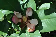The flowers are fragrant, cup-shaped, 15–25 cm broad, with nine thick, creamy white to pink tepals; stamens ca. 210 and ovoid gynoecium with ca. 100 carpels.[1]