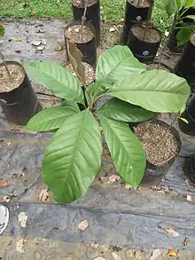 This tree can reach a height of up to 25 m and up to 60 cm in diameter. The bark is grey coloured with dark streaks. Young leaves have a woolly and golden pubescence. Leaves are spiralled, elliptic and chartaceous, 15.3 cm to 34 cm in length and 10.6 to 21.4 cm in width. They have a dense, golden pubescence on the underside, with a petiole streaked longitudinally. Flowers are cream-coloured, with a floral bud with three pubescent bracts, three sepals and eight pulpy petals. Fruits are small and elliptical.[2][3][4]