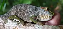 The existence of this species was first realized in 2002 when a dead juvenile was found by a researcher. In the next few years, two further specimens were discovered, including one dropped by a twig snake after it had been startled. The Magombera chameleon was scientifically described as a new species in 2009.[2][3]