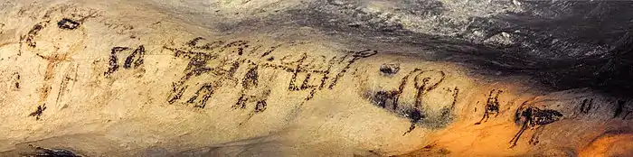 Painted signs can be organised into four thematic groups: anthropomorphic, zoomorphic, geometric, and symbolic (astronomic?) figures.[7] For the first group, there are bitriangular silhouettes with raised rounded arms (females with a sort of a waist bow, males with legs and sex like a trident, sometimes stylised like a "bottle opener"), archers, ithyphallic figures, copula, linear schematic anthropomorphic figures with raised arms (sometimes like dancing) and "fungiforms". Regarding zoomorphic items, there are caprids, bovids, dogs, "ostrich-like" animals (big birds) and schematic linear quadrupeds. Geometric signs show T-shaped figures, vertical parallel lines, horizontal zigzags, vertical parallel zigzags, branch-like or tree-like figures, chessboard patterns, rhombi, horizontal stair-like patterns, crossed networks, honeycomb networks and crossed circles. Few rayed circle figures, mainly the two unica of the so-called calendar scene, likely represent a sun depiction.[8]