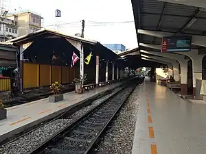 Mahachai railway station is a railway station located in Mahachai subdistrict, Mueang Samut Sakhon district, Samut Sakhon province. It is a class 1 railway station and is the main railway station of Samut Sakhon. As there is no bridge connecting the two separate sections of the Maeklong Railway, passengers continuing onwards in either direction must use a ferry to cross to Ban Laem railway station on the opposite side of the Tha Chin River. Currently, 34 rail services operate at the station.[1]