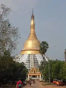 The relics arrived in 1576.[4] In 1599, King Anaukpetlun conquered Bago and removed the relics to Taungoo.[4] In 1636, King Thalun removed the relics to Inwa, enshrining them at the Kaunghmudaw Pagoda in Sagaing.[4] Throughout its history, the pagoda has been destroyed by several earthquakes on the Sagaing Fault, on 13 September 1564, 1583, and 8 October 1888, and completely leveled in 1930.[7][3] Mahazedi Pagoda was rebuilt in the 1950s.[6]