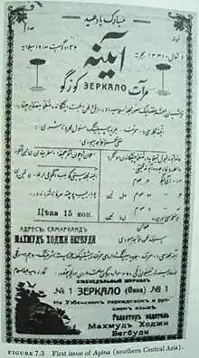 Mehmudkhodja Behbudiy was born on 20 January 1875 (new calendar) on the outskirts of Samarkand in Russian Turkestan. Many members of his family were Islamic scholars, and Behbudiy too became a Qazi following his madrasah education. After an eight-month trip to Arabia, Transcaucasia, Istanbul and Cairo in 1899, which brought him into contact with the cultural movements in Islam in the wider world, he started his public career in Central Asia in 1903. He subscribed to Ismail Gaspirali's Tercüman and changed his name from ibn Behbud Chodscha to Behbudiy.[1] He also wrote articles in support of Jadidism in all Central Asian newspapers and in 1913 launched Ayina ("The Mirror"), a weekly magazine, which he published almost by himself for twenty months.[2] He also published the newspaper Samarkand.[3] His friends included Siddiqiy Ajziy, Abduqodir Shakuriy and Haji Muin.