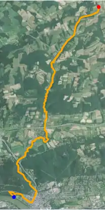 Satellite map of Mahoning Creek. The red dot is the stream's source and blue dot is its mouth.