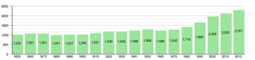 As of 2000, the gender distribution of the population was 50.1% male and 49.9% female.[13] As of 2015, children and teenagers (0–19 years old) make up 19.4% of the population, while adults (20–64 years old) are 62.0% of the population and seniors (over 64 years old) make up 18.6%.[8] In 2015 there were 1,204 single residents, 1,180 people who were married or in a civil partnership, 158 widows or widowers and 225 divorced residents.[14]