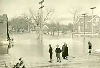In 1929, a new centralized post office was built to the east of the present 1932-dedicated Anderson-Mayberry American Legion Hall (named for servicemen Edgar Anderson and Edwin Mayberry, who both died from the Spanish flu while based at Fort Devens).[2] On the left side of this building was the Fidelity Trust Company. The bank failed early in the Great Depression of the 1930s.[34] To the east of the post office stood the Knights of Pythias Hall.[34] It became the Pastime Theatre in the 1920s, then Yarmouth Theatre between 1942 and 1956. Harriman's IGA Foodliner moved here in the late 20th century from its Main and West Elm Streets location. A KeyBank (formerly Casco Bank) and the parking lot for NYA's Priscilla Savage Middle School now stand in its place.