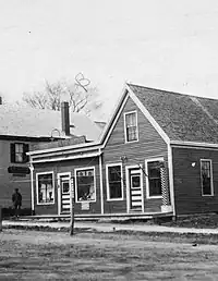 The post office until around 1905. The first postmaster was Payne Elwell (1744–1820) in 1793. (He lived in the building that is now 162 Main Street, which stands on the former site of the Knights of Pythias Hall, Westcustogo Lodge, No. 33)[18] He was succeeded in 1803 by Samuel P. Russell, David Drinkwater in 1804, John Hale in 1810, Daniel Mitchell in 1816, James C. Hill in 1834, Jacob G. Loring in 1842 and Reuben Cutter in 1845.[4] When the town split occurred, the office name was changed in 1852 to Yarmouth from North Yarmouth. Reuben Cutter resumed the role, and was followed by Otis Briggs Pratt in 1861 and Nicholas Drinkwater in 1866. Lucy V. Groves was appointed in 1868, becoming the first woman named or elected to an official position in the town of Yarmouth. Lucy Q. Cutter succeeded her in 1887, Melville C. Merrill in 1898, Frank Howard Drinkwater in 1911, Frank O. Wellcome in 1914 and Ernest C. Libby in 1936.[19]