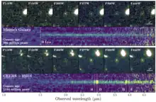 ![]() Maisie’s Galaxy and CEERS-93316 shown at six infrared wavelengths, with small circles highlighting each object. | |