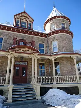 The hipped, four-sided roof is covered with Canadian-style sheet metal, with a conical turret at the northeast corner. The main dormer features a Venetian window with columns and ornamentation, topped by a circular pediment. The other dormers have arched roofs, cornices with small decorative brackets, and molded friezes. The eaves are decorated with voluted modillions. The sash windows are tall and narrow.[3]