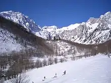 The European black pine (Pinus nigra) and Bosnian pine (Pinus heldreichii, P. leucodermis) as well as beech (Fagus Sylvatica L.) are widely spread in the south and west of the mountain.[4] The Norway spruce (Picea excelsa) is sparsely found in the lowest slopes and mostly in the valley of Valbona.