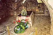 Makarios III died of a heart attack on 3 August 1977. He had been experiencing issues with his heart earlier that year. This was no doubt influenced by his many years of heavy smoking. In order to confirm the cause of death, Makarios' heart was removed during an autopsy, and has since been preserved in his former bedroom in the Archbishop's Palace.[15] He is buried in a tomb on Mount Throni, a site he personally chose. The tomb is near Kykkos Monastery, where he was a novice in the 1920s and 1930s.