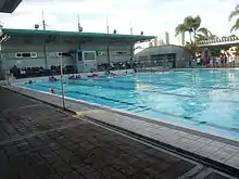A prominent feature of the park is the monument to Andrés Bonifacio located on the western side near the parking area.[6] The monument, designed by Filipino sculptor Juan Sajid Imao, son of National Artist Abdulmari Imao, was erected in 1997 to commemorate Bonifacio's death centennial.[7] The park also features a small lake, fountains, a man-made waterfall, an aviary, amphiteater, pavilion, and gazebos, including a floating octagonal gazebo.[2][8] The park's Artist Pavilion serves as a function hall and is a favorite venue for social activities and receptions such as wedding and birthdays.[9] A pedestrian trail known as the Rizal Riverwalk extends along the Pasig River for approximately 1 kilometer (0.62 mi) from the Makati Park and Garden to the Guadalupe Ferry Station near EDSA. The Makati Aqua Sports Arena is a popular recreational facility located on the park's eastern side. It contains two swimming pools, one of which is Olympic-sized, built in 2006 at a cost of ₱12 million.[10] The arena is open from Tuesdays to Sundays and charges an entrance fee.[11] The Makati Park also charges fees for use of the Artist Pavilion.[9]