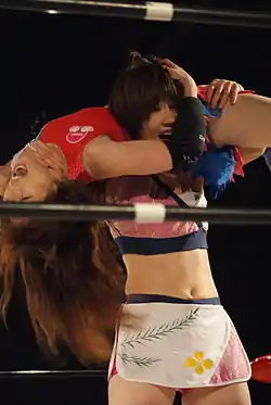 On December 3, Narumiya was defeated by Hikaru Shida in a singles match.[20] Afterwards, the two began regularly teaming together,[21][22] which led to Narumiya winning her first professional wrestling title, when, on December 28, she and Shida defeated Emi Sakura and Tsukushi for the International Ribbon Tag Team Championship.[23] Narumiya and Shida made their first successful title defense on January 7, 2012, defeating the Lovely Butchers (Hamuko Hoshi and Mochi Miyagi).[24] The following day, Narumiya took part in Bull Nakano's retirement event, where she and Oz Academy's Akino faced JWP Joshi Puroresu's Kayoko Haruyama and Sendai Girls' Pro Wrestling's Ryo Mizunami in a "Guillotine Drop match", based around all four using a variation of the leg drop as their finisher. Mizunami won the match for her team by pinning Narumiya.[25] Back in Ice Ribbon, Narumiya and Shida made their second successful defense of the International Ribbon Tag Team Championship on January 25, by defeating Dorami Nagano and Hailey Hatred.[26] Narumiya's and Shida's reign ended on February 5 at Yokohama Ribbon, when they were defeated by Dropkickers (Tsukasa Fujimoto and Tsukushi).[27] On February 12, Narumiya made her debut for Union Pro Wrestling, losing to Cherry.[28] On March 20 at Ice Ribbon March 2012, Narumiya teamed with joshi veteran Toshie Uematsu, in Uematsu's final Ice Ribbon appearance before her retirement, to defeat Hikari Minami and Riho in a tag team match.[29][30] At the following major event, Golden Ribbon 2012 on May 5, Narumiya entered the second annual Go! Go! Golden Mixed Tag Tournament, teaming with Osaka Pro Wrestling's Masamune. In their first round match, Narumiya and Masamune defeated the previous year's winning team, Makoto Oishi and Neko Nitta. After defeating Hikaru Sato and Riho in the semifinals, Narumiya and Masamune advanced to the finals, where they were defeated by Kurumi and Ribbon Takanashi.[31]