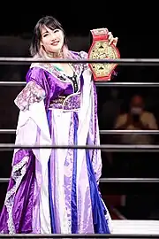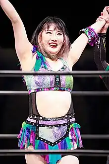 Makoto's 2009 was highlighted by a feud with her former partner Etsuko Mita, which built to Mita's retirement match on November 1, 2009, where she defeated Makoto.[27][28][29] The feud with Mita also led to the evolution of Makoto's character, turning her from a weak and scared comedic character to a more serious competitor.[1][2] In 2010, Makoto began making appearances for other promotions such as Kaientai Dojo, Osaka Pro Wrestling, Pro Wrestling Zero1 and Smash.[27] On December 26 at Ribbon Mania 2010, Makoto faced Tajiri in a losing effort.[30] In January 2011, Makoto became the leader of a stable named "Heisei YTR" (Young Traditional Revolution), which also included Chii Tomiya, Hikari Minami, Kurumi, Riho and Tsukushi.[31] The group mainly feuded with the "Ichinisanshidan" stable, which included Hikaru Shida, Miyako Matsumoto, Mochi Miyagi, Tsukasa Fujimoto and Mika Iida, who was originally a member of Heisei YTR, but switched sides early on in the rivalry.[31][32] On February 6, Makoto and Riho made it to the finals of the Ike! Ike! Ima, Ike! Ribbon Tag Tournament, before being defeated by Hikaru Shida and Tsukasa Fujimoto in a match that was also contested for the International Ribbon Tag Team Championship.[33] On March 21, Makoto had another high-profile match against a male wrestler, when she was defeated by Taka Michinoku at Ice Ribbon March 2011.[34] During the first half of 2011, Makoto also made several appearances for Union Pro Wrestling, where she portrayed a tougher villainous character, working under the ring name Makoto-hime ("Princess Makoto") and managing Cao Zhang and Choun Shiryu during their Big China Unified Nakahara Tag Team Championship reign.[11][35][36]