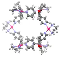 Structure of Fujita's {[Pd(en)]6L4}12+ (en = ethylenediamine, L = tripyridine ligand CH3CO2C(C5H4N)3).[4]