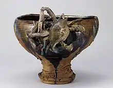 The most distinctive feature of Kozan's works in the early period was the unprecedented amount of three-dimensional sculptures applied to them. This three-dimensional decoration technique was called Takaukibori (高浮彫). This was an epoch-making technique that was able to create three-dimensional shapes at a low cost compared to Satsuma ware, which requires a high production cost to create three-dimensional shapes using gold. Birds such as raptors and Pigeons, mammals such as bears and cats, crustaceans such as crabs, plants such as cherry blossoms and grapes, and fictional creatures such as oni and anthropomorphic frogs were frequently used as motifs for sculptures.[21] During the 1890s Kōzan developed a style of decoration that combined multiple underglaze colours on each item.[22] The technical sophistication of his underglazes increased during this decade as he continued to experiment.[23] In the decade from 1900 to 1910 there was a substantial change in the shape and decoration of his works, reflecting Western influences.[24] And his vigorous pursuit of glaze research and perfection transformed his work into a flat, colorful, transparent design. His work strongly influenced Western perceptions of Japanese design.[25] He sometimes used designs from the Qing dynasty, especially dragon motifs.[26]