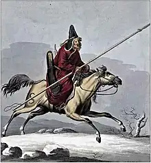 The malahai[a] (Russian: малаха́й or малакай,[b] Kazakh: малақай) is a historical headgear originating in present-day Kazakhstan, which was adopted in some of other regions of Central Asia and worn throughout the Russian Empire from the mid-18th to mid-19th centuries. It is a fur hat with a noticeably high conical, cylindrical,[1] or quadrangular[2] crown[c] and flaps that are typically four: two long side-flaps covering the ears, a wide rear one covering the neck and shoulders, and a short front one functioning as a visor. It is lined with furs of diverse animals, which include badger, fox, and wolf.