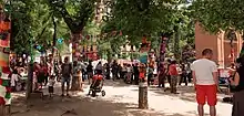 Malasaña is a neighborhood and a center for the 'hipster' movement, with a high quantity of bars and clubs with many young people. Its history, which stretch back several decades, have led to the area's distinct musical and artistic tastes.[2] Botellons (a meeting of people drinking openly on the street, often before going to bars or discos) are common in this neighbourhood. Large ones were held in Plaza de dos de Mayo before the police stopped the nightly practice after an unpopular festival in 2006. Botellon´s involving up to 200 people happen and the plaza where it occurs changes depending on how the police crack down on them. Parts of the neighbourhood closer to Gran Via has many sex clubs, sex shops and street activity. Drugs are rarely sold openly on the street due to police crackdowns in the early 2000s (decade). It is common for foreign women and men to illegally sell beer openly all over the neighbourhood.