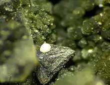 Yellowish-white sphere on matrix. Field of view 2 mm. | |