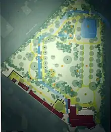After the Second World War, the destroyed part of the Malkasten-Haus and its terrace needed rebuilding. In the process, Roland Weber, one of the most important landscape architects of the 20th century, redesigned the garden.[1]