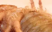 Malleolus (plural: malleoli) is a fan-shaped chemoreceptor or racquet organ, an array of which are carried in pairs on the ventral or undersides of Solpugidae. They are the counterpart of pectines in scorpions, and modified walking limbs in the uropygids and amblypygids as well as the pedipalps in spiders and other arachnids.[1][2] Most species have 5 pairs of malleoli on the ventral surface of the fourth pair of legs of both sexes, while juveniles and other species have 2-3 pairs.[3]
