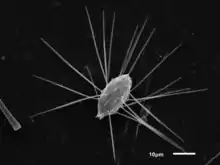 Mallomonas is a genus comprising unicellular algal eukaryotes and characterized by their intricate cell coverings made of silica scales and bristles.[1] The group was first named and classified by Dr. Maximilian Perty in 1852.[2] These organisms live in freshwater and are widely distributed around the world.[3] Some well known species include Mallomonas caudata and Mallomonas splendens.