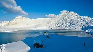 Tevnoto Lake is the largest and northernmost of the group, located in the immediate vicinity of the summits of Momin Dvor and Valyavishki Chukar.[4] It has an elongated curved shape slightly resembling a kidney. Reaching length of 487 m, width of 220 m and area of 62,490 m2, it is the eight largest lake in the mountain range and largest one in Bulgaria above 2,500 m. Its exact altitude is 2,519 m, which makes it the sixteenth highest lake in Pirin. The depth is 3.9 m; the water volume is 116,570 m3.[4][5] The homonymous Tevno Ezero shelter is situated near the out-flowing stream to the south.[4][6] Its natural beauty and majestic surroundings of rugged peaks make it a popular tourist destination.[6]