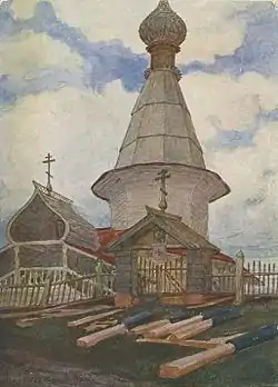 Close to Maloshuyka, in the village of Abramovskaya, the ensemble of the Maloshuyka Pogost, consisting of wooden St. Nicholas Church (1638), the Presentation of Jesus at the Temple (1873), and the bell-tower (1825), is located.[11] This is one of the few remaining wooden triple church ensembles, which consist of two churches (a bigger, unheated, church is used in the summer; a smaller, heated church, is used in the winter; and a bell-tower).