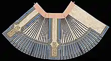 The waistband of the mamianqun in this period was larger than those worn in the previous dynasties.[3] The wide waistband was without decoration; it was also made of different materials than the main skirt. It was typically made of cheaper fabric than the rest skirt as it was hidden by the upper garments.[16] The main material used in the making of the skirt was typically silk while the choice of fabric for the waistband was usually cotton or hemp; the use of such cheaper fabric over silken fabric was also functional as it prevented the skirt from slipping from slipping down its wearer's body.[10][18] The mamianqun were also held by loops and buttons which were found inside the waistband.[3][10] Ties could also be used instead of loops and buttons.[18] Several historical mamianqun in its variant styles are stored in museums in and outside of China.[40][41][42]