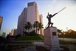 Mandarin Oriental Manila in 2012, along with the statue of General Pio del Pilar at the intersection of Makati Avenue and Paseo de Roxas.