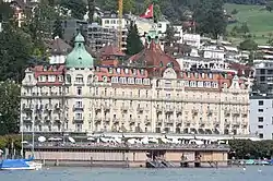 In 1903 Franz Josef Bucher, a farmer's son, who by this time had become well established as a hotel pioneer-entrepreneur, purchased a 3,285 square metre plot of land at one end of the "National Quai" ("Nationalquai") in Lucerne[2] for a price of 880,000 Swiss francs.[3] The price equated to 270 Swiss Francs square metre which at that time was "sensationally" expensive for a 3,000 square metre building plot.[2] Construction began in July 1904, to designs by architect Heinrich Meili-Wapf, and less than two years later, on 7 May 1906, the Palace Hotel Luzern opened.[4] The hotel cost a "sensational" four million Swiss francs.[3] All the south-facing rooms with a lake view, as well as all the east-facing rooms, came with an en suite bathroom, which was considered the height of luxury.[3] The Palace Hotel Luzern was also unusually large, with a total of 120 private bathrooms shared between 350 beds.[2] That made it substantially larger than the city's existing grand hotels: The National had 79 private bathrooms shared between 450 beds, while the Schweizerhof made do with only 70 private bathrooms shared between 400 beds.[2] The Palace Hotel Luzern was considered one of the most elegant hotels in the world.[5]