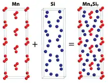 Manganese disilicide (MnSi2) is an intermetallic compound, a silicide of manganese. It is a non-stoichiometric compound, with a silicon deficiency expressed as MnSi2–x. Crystal structures of many MnSi2–x compounds resemble a chimney ladder and are called Nowotny phases. They include MnSi2 (x=0), Mn4Si7 (x=0.250), Mn11Si19 (x=0.273), Mn15Si26 (x=0.267) and Mn27Si47 (x=0.259). These phases have very similar unit cells whose length varies from 1.75 nm for MnSi2 or Mn4Si7, which have almost the same structures, to 11.8 nm for Mn27Si47.[5]