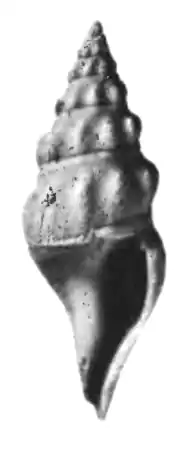 (Original description) The small shell has a fusiform shape. Its whorls are bluntly carinate. The spire is moderately sharp, of about the same length as the aperture. The protoconch is not well enough preserved on the type for description. The aperture is of medium width, narrowing anteriorly where it is produced to form a siphonal canal of moderate length. The outer lip is not preserved on the type but shown by growth lines to recurve above the periphery to form a moderately broad, moderately deep sinus. The parietal wall is lightly callused posteriorly and slightly resorbed anteriorly. The sculpture consists of blunt, slightly protractive axial ribs, about seven visible from an angle, and fine somewhat irregular spiral lirations which are slightly more crowded on the subsutural slope and slightly coarser on the columella. Some secondary threads are present. The suture is appressed with a well defined subsutural collar.[1]