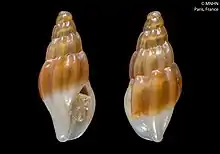 The shell has 7 or 8 stout ribs. The whorls are without shoulders. The spire varies in length. The spire and the upper half of the body whorl are chestnut- or chocolate-color, while the lower half of the body whorl is light yellowish brown, sometimes yellowish brown with darker lineations.[2]