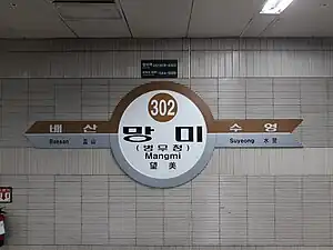 Mangmi Station (Korean: 망미역; Hanja: 望美驛) is a station of Busan Metro Line 3 in Mangmi-dong, Suyeong District, Busan, South Korea.
