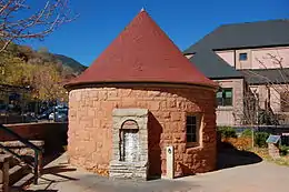 Medical practitioners, such as Dr. Edwin Solly, promoted the health benefits of the "pure air" and sunny Rocky Mountain climate as the "world's best suited therapeutic environment" for the treatment of tuberculosis.[15] He also believed in the benefits of mineral spring water which drew tourists and the infirm, particularly people with tuberculosis, to the area. Some springs were enclosed as the town grew. One of the enclosures, in red sandstone and under a "conical roofed structure", is the Cheyenne Spring House. There were more than 50 drilled wells and springs after the turn of the century. Since then, more were enclosed. After a period when the town's popularity diminished, some springs were closed, capped or paved over. Then the Mineral Springs Foundation was formed in 1987 to restore some of the springs and promote the benefits of the town's spring water. Walking tours of the town's springs are called "Springabouts".[5][8][9]